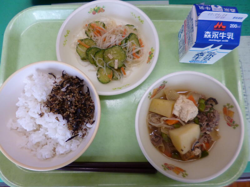 麦ごはん・肉じゃが・春雨の酢の物・手作りひじきのふりかけ・牛乳