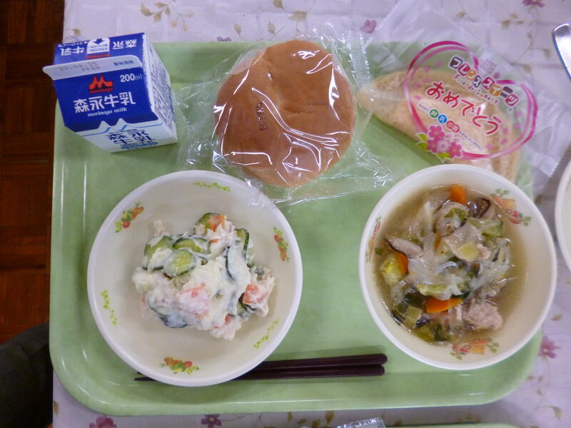 コッペパン、牛乳、手作り肉団子のスープ、ポテトサラダ、お祝いクレープ