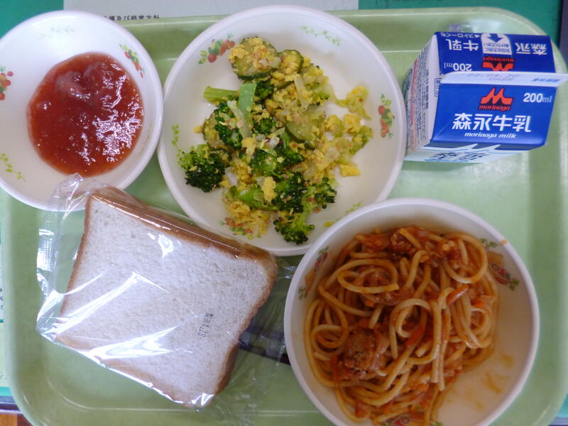 食パン、牛乳、スパゲティミートソース、グリーンエッグサラダ、手作りいちごジャム