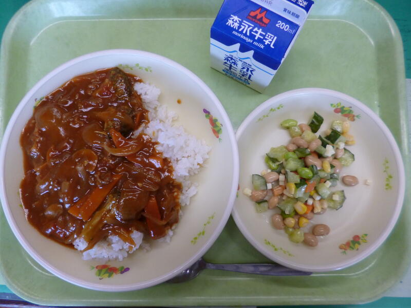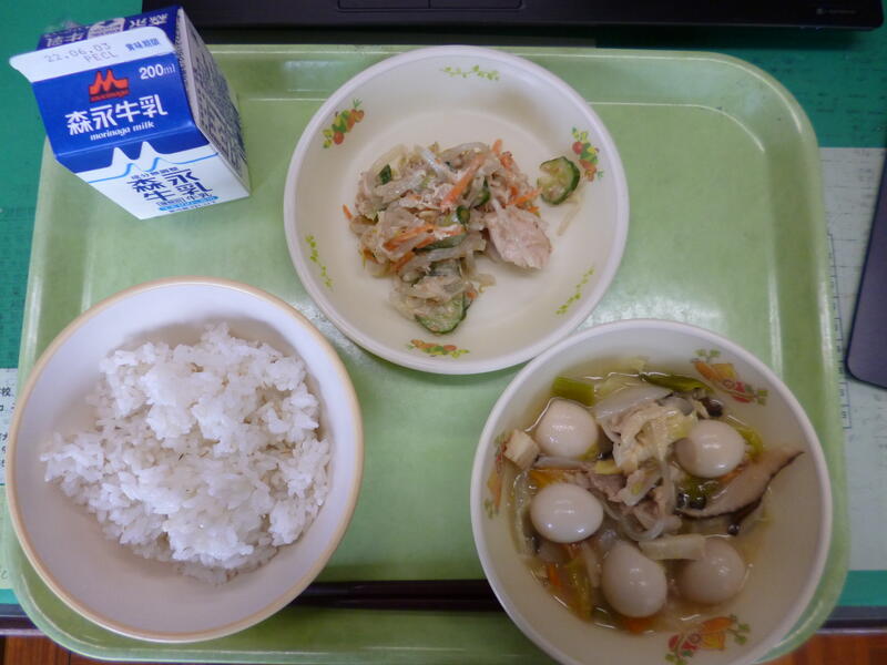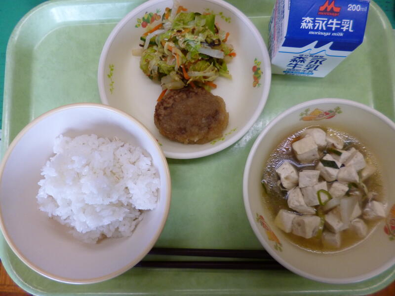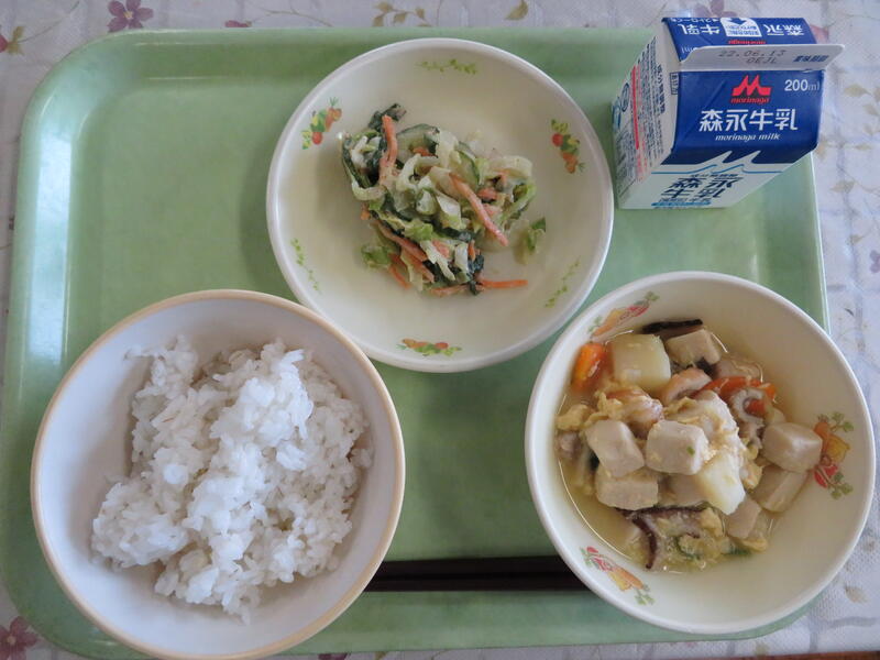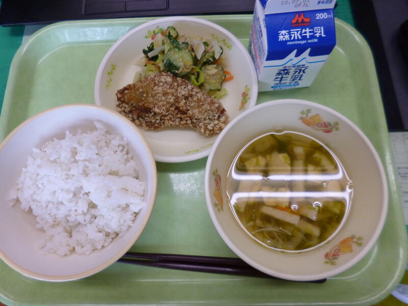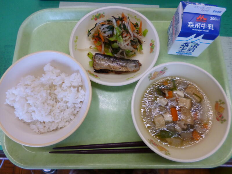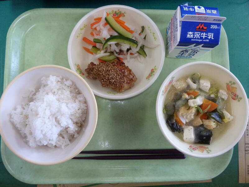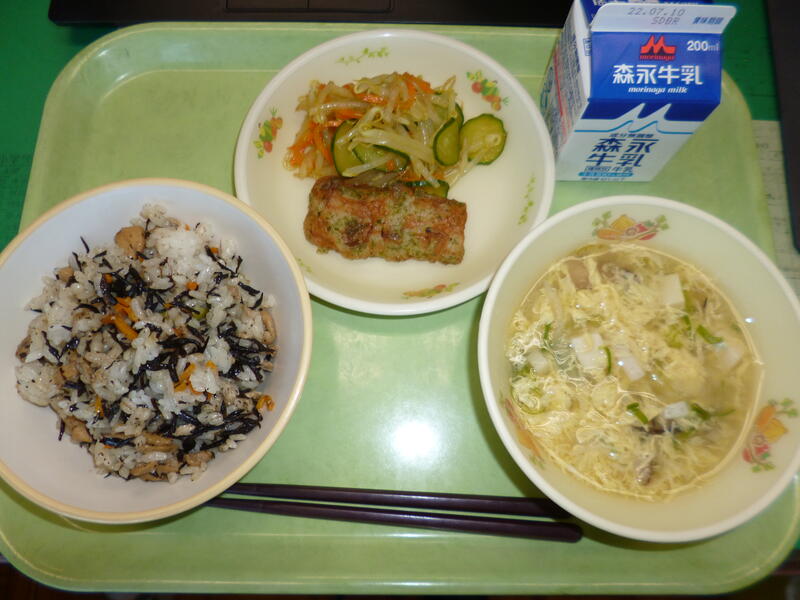 ひじきご飯、牛乳、かきたま汁、ちくわの磯辺揚げ、もやしのカレーサラダ
