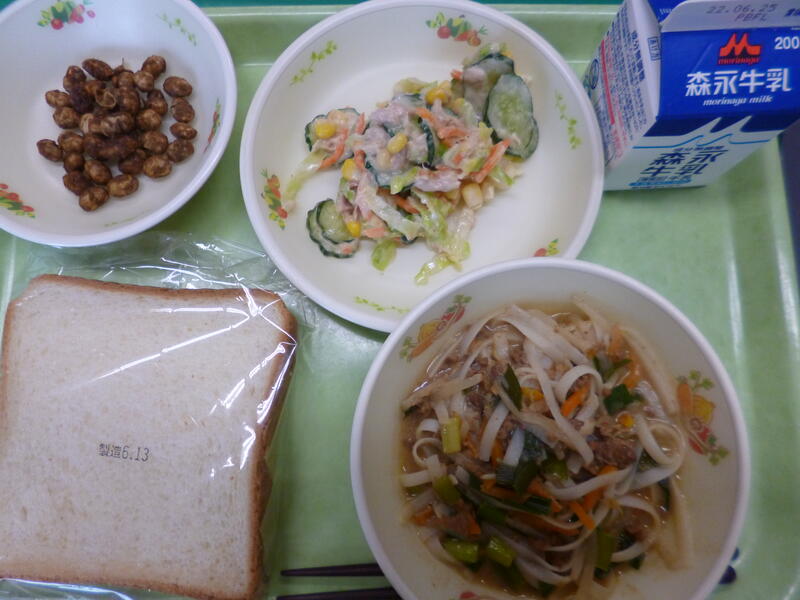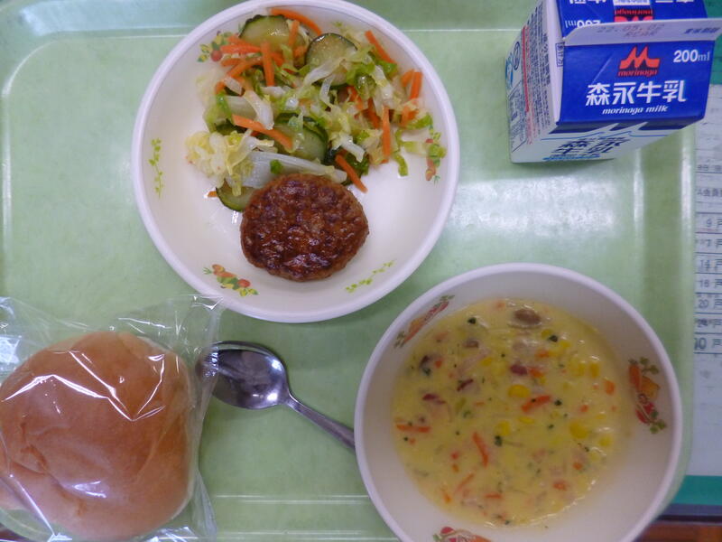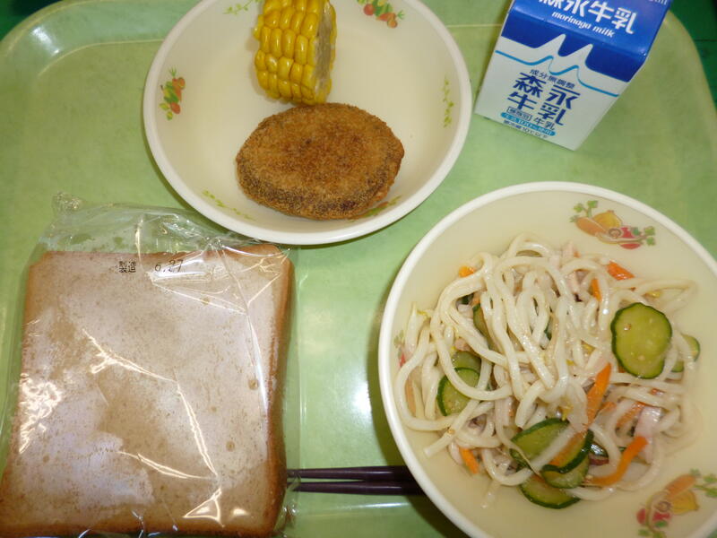黒糖パン、牛乳、冷やし中華、チキンメンチカツ、とうもろこし
