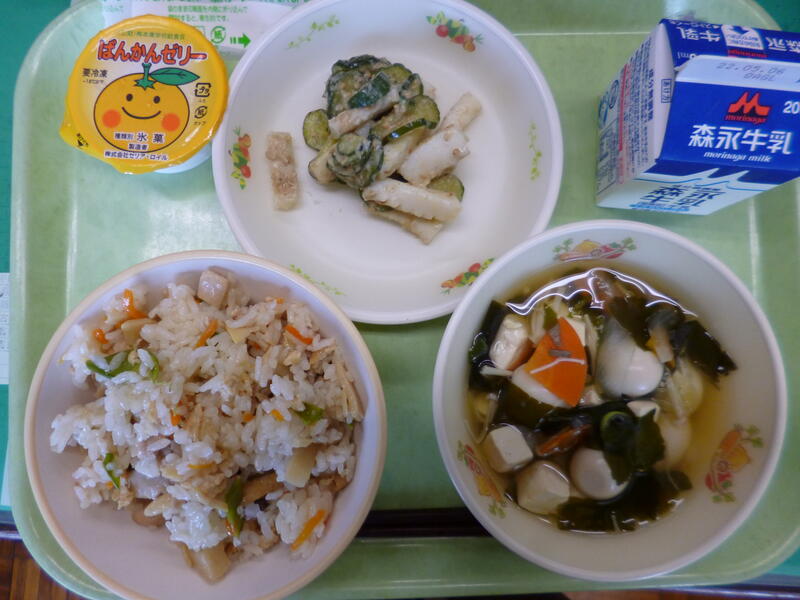竹の子ご飯、牛乳、うずらの卵のすまし汁、いかの酢味噌和え、熊本産晩柑ゼリー