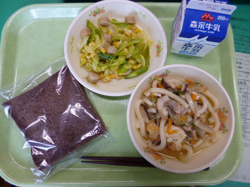 ココアパン、牛乳、五目うどん、アスパラソテー