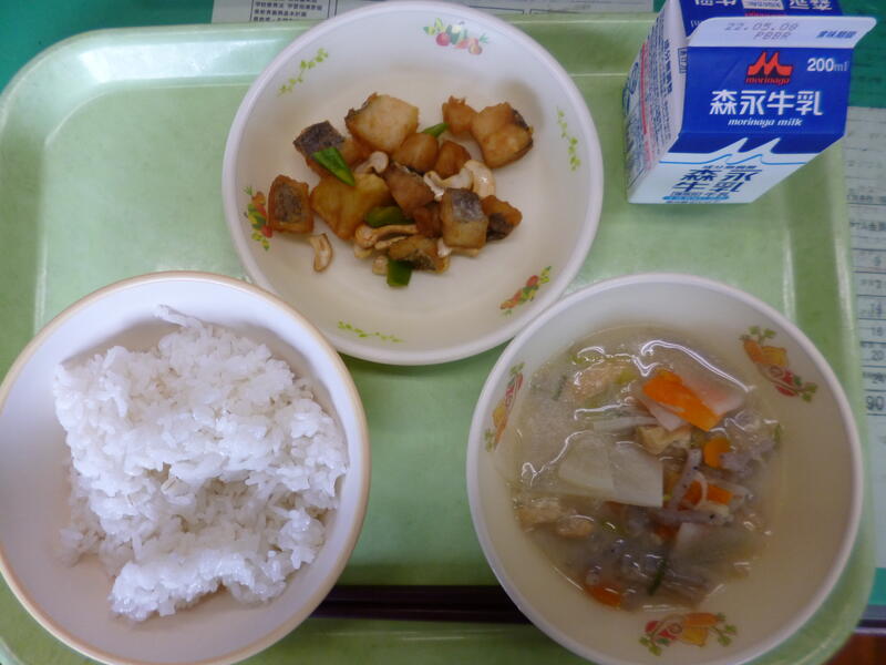麦ごはん、牛乳、玉ねぎとじゃがいものみそ汁、ホキのアーモンドソースかけ、竹の子のおかか和え
