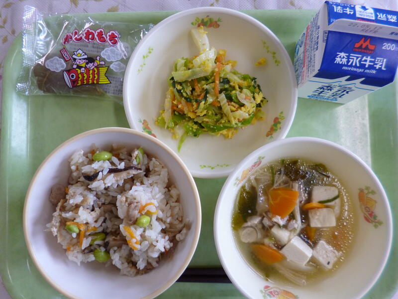 混ぜご飯、牛乳、豆腐汁、千草和え、柏餅