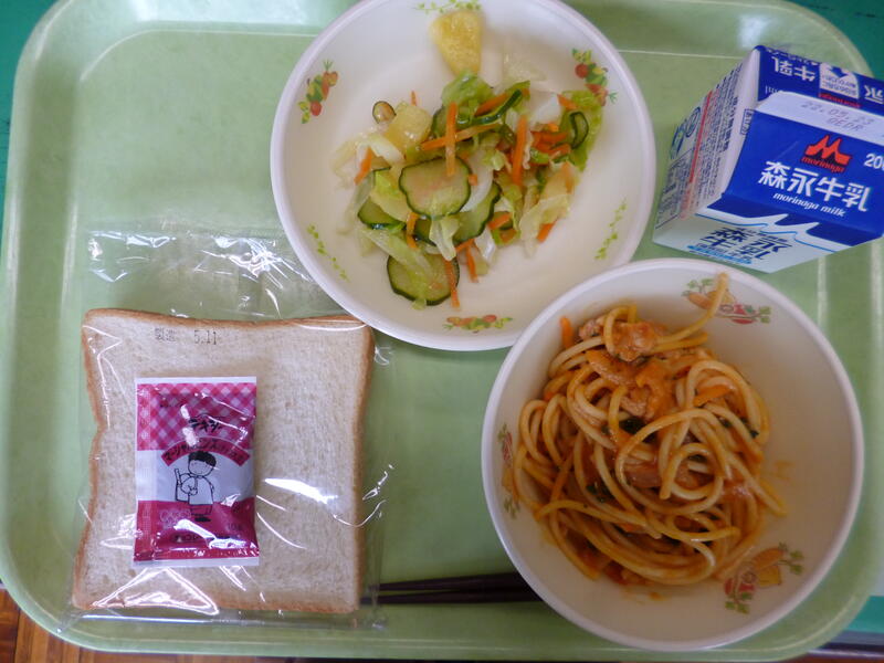 食パン、牛乳、マーシャルビーンズ、トマトクリームスパゲティ、キャベツパインサラダ
