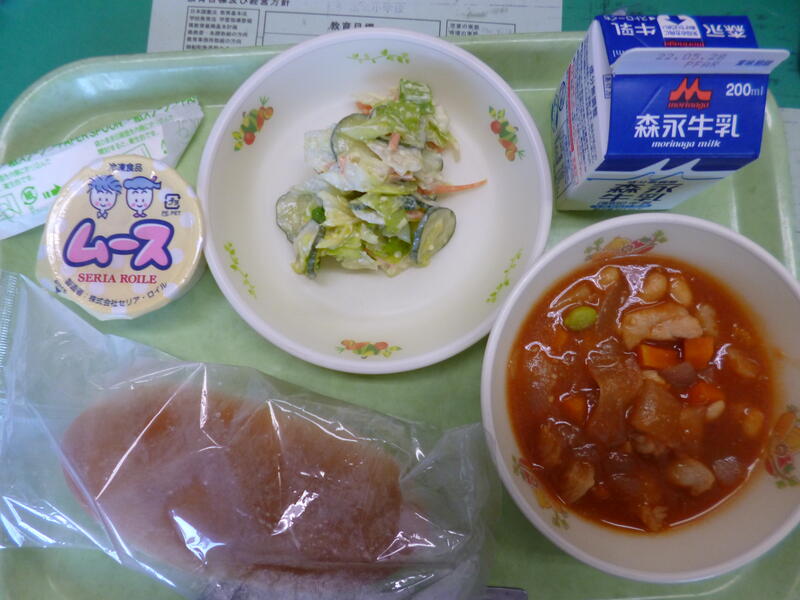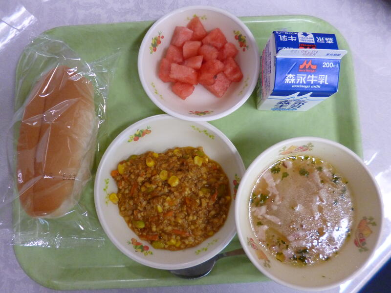 コッペパン、牛乳、コンソメスープ、カレーミートビーンズ、すいか