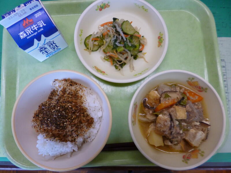 麦ごはん、牛乳、厚揚げのそぼろ煮、ちりめん和え、手作りふりかけ