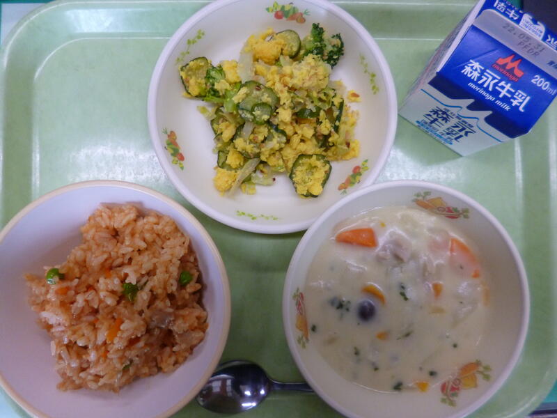 チキンライス、牛乳、じゃがいものポタージュ、グリーンエッグサラダ