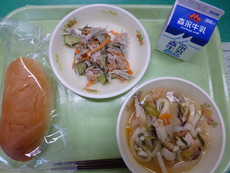 ミルクパン、牛乳、きつねうどん、ごぼうサラダ