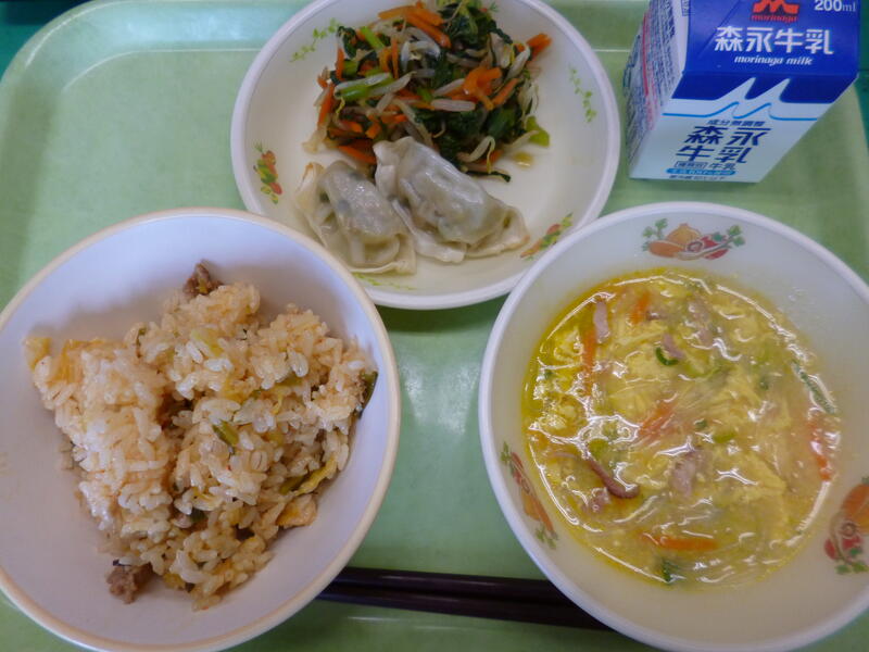 キムチごはん、牛乳、コーンと卵のスープ、餃子、小松菜の中華和え