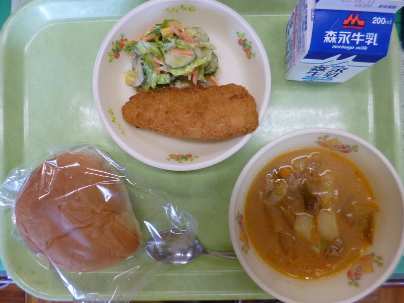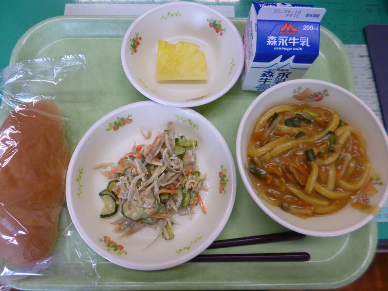 コッペパン、牛乳、カレーうどん、かみかみサラダ、パイン