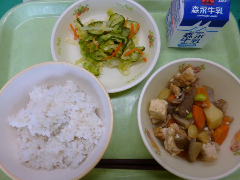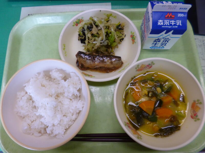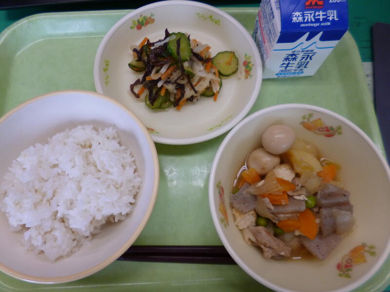 麦ごはん、牛乳、のっぺい汁、鰯の生姜煮、小松菜の昆布和え