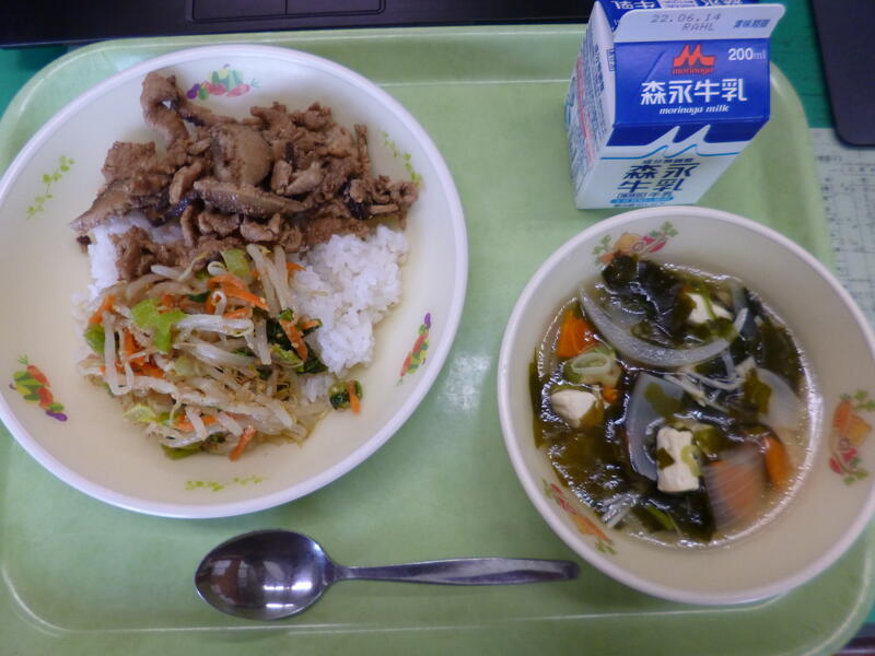 ビビンバ(肉、ナムル、ご飯)、牛乳、わかめスープ