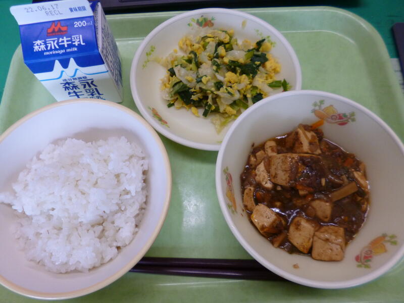 麦ごはん、牛乳、麻婆豆腐、にらと卵のサラダ