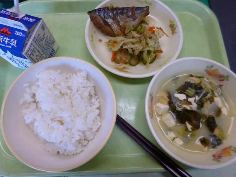 麦ごはん、牛乳、みそ汁、鯖のソース煮、梅和え