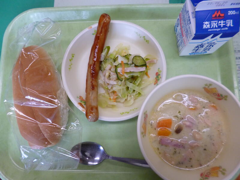 セルフドック(キャベツのマスタードサラダ、ウインナー)、牛乳、白いんげん豆の豆乳スープ