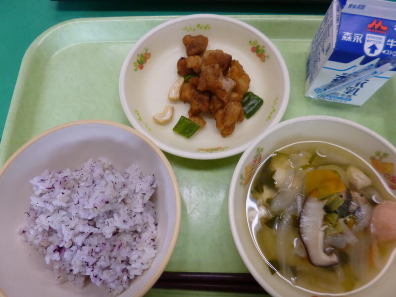 ゆかりご飯、牛乳、つみれ汁、鶏肉とレバーのナッツ和え
