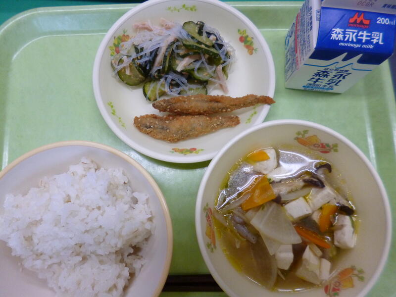 麦ごはん、牛乳、けんちん汁、春雨の酢の物、きびなごゴマフライ