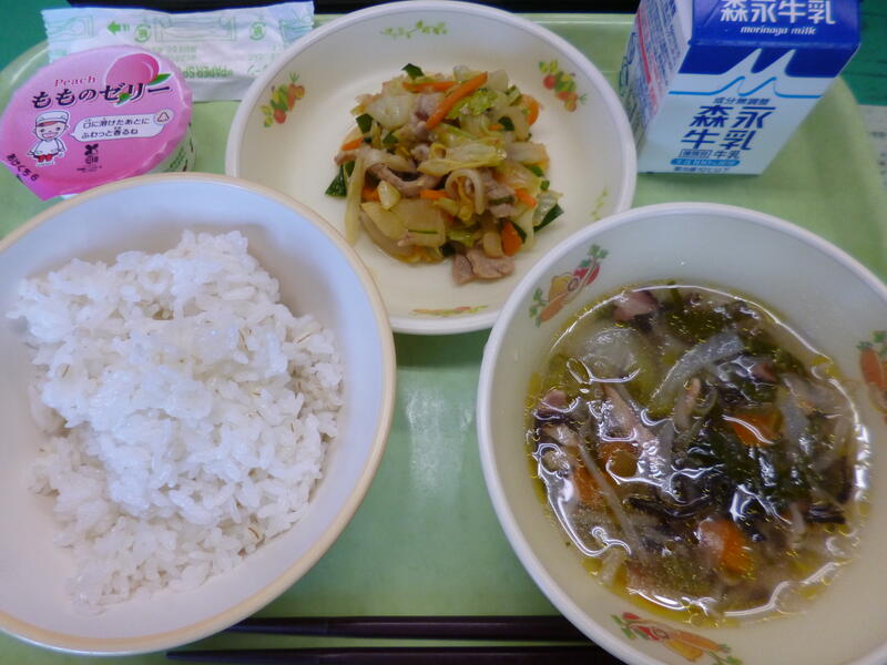 麦ごはん、牛乳、中華スープ、豚キムチ、桃ゼリー
