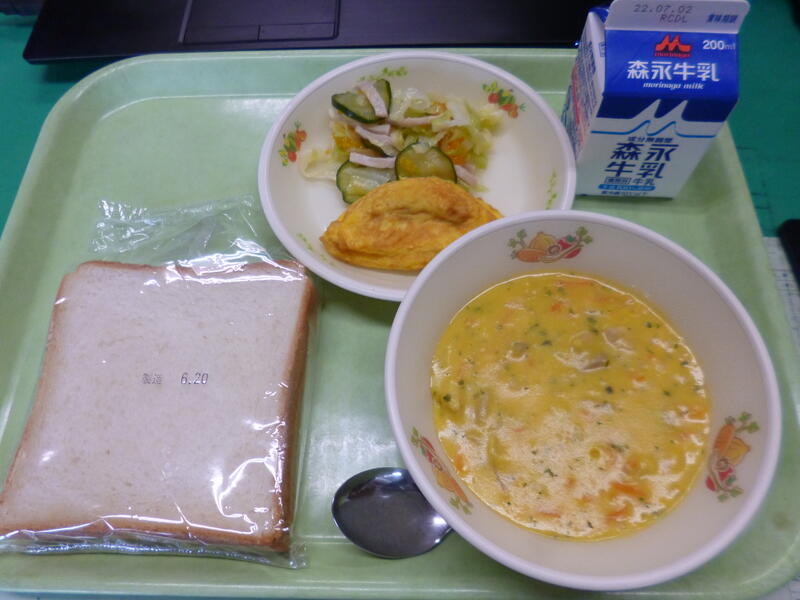 食パン、牛乳、キャロットポタージュ、スペイン風オムレツ、ミックスサラダ