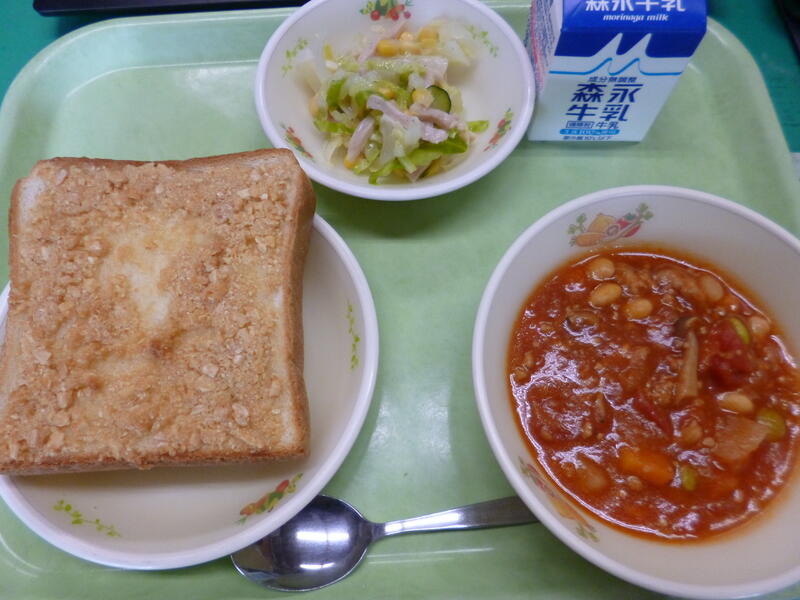 アーモンドトースト、牛乳、大豆とひき肉のトマト煮、コーンサラダ