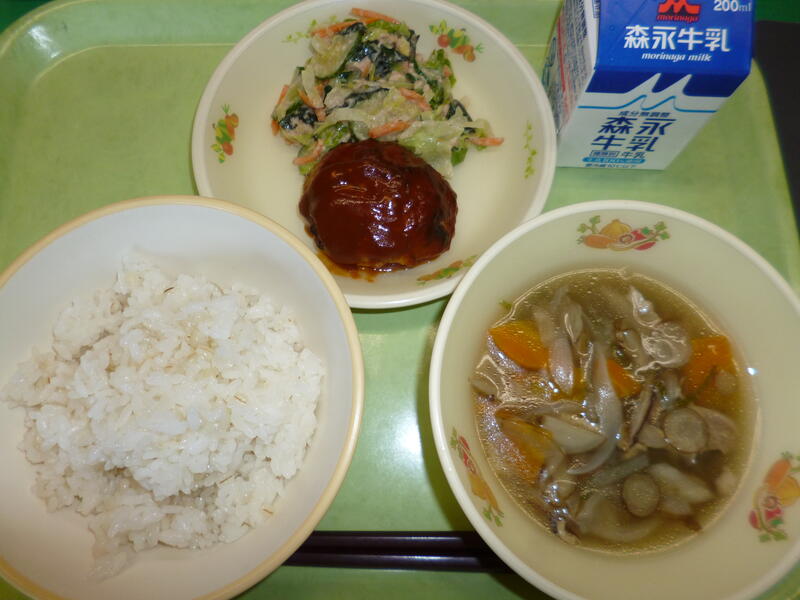 麦ごはん、牛乳、鶏ごぼうスープ、手作りハンバーグのデミグラスソース、御船川とツナのサラダ