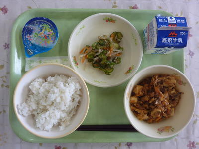 むぎご飯、麻婆豆腐、おくらのおかか和え、七夕ゼリー、牛乳