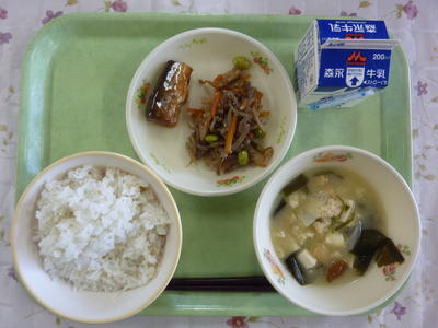 麦ご飯、みそ汁、いわしのトマト煮、根菜のきんぴら、牛乳