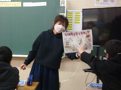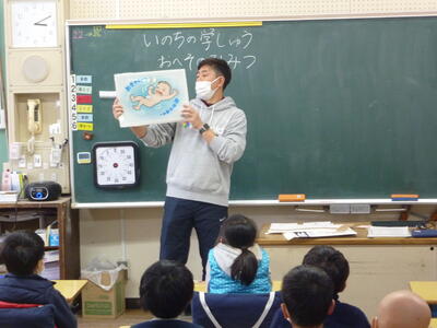 2年生も学習しました。内容は「おへそのひみつ」でした。紙芝居でおへその秘密を学んだ子どもたちは、「家にへその緒がある」「つながっているおへそを切るときは痛くないんですか」といろいろな思いや疑問を出していました。