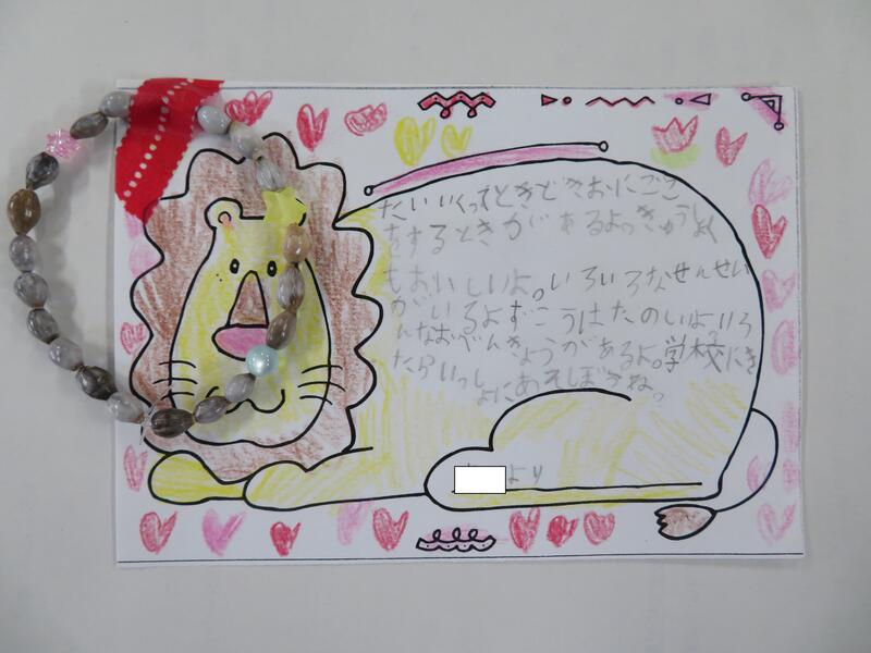 そこで、1年生は来校できなくなった新入学児に向けてメッセージカードを作りました。じゅず玉のリングのプレゼントもついています。