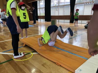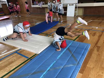 前回りや後ろ回りなど、基本的な回り方を練習しました。後ろ回りは難しいので、踏切板で傾斜を作りました。