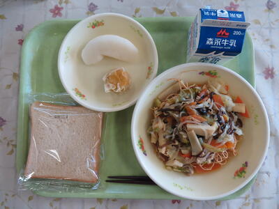 黒糖パン、パリパリ焼きそば、にんじんシューマイ、梨、牛乳