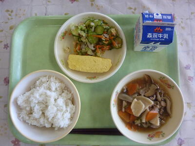 麦ごはん、八戸せんべい汁、厚焼き卵、野菜のおかか和え、牛乳