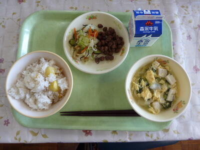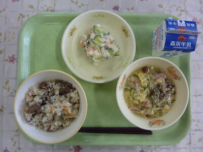 芋栗ごはん、かきたま汁、ひじき和え、ココア豆、牛乳