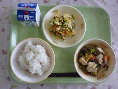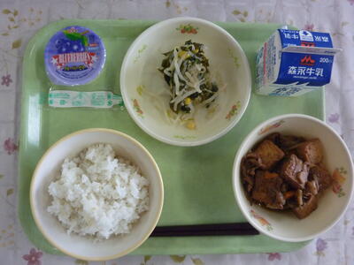麦ごはん、ちゃあじゃん豆腐、中華和え、ブルーベリーゼリー、牛乳
