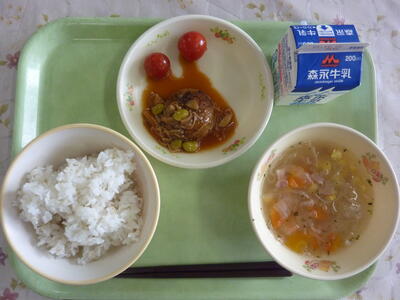 麦ごはん、オニオンスープ、ハンバーグのきのこソース、ミニトマト、牛乳