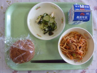 パインパン、スパゲティミートソース、イタリアンサラダ、牛乳