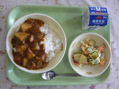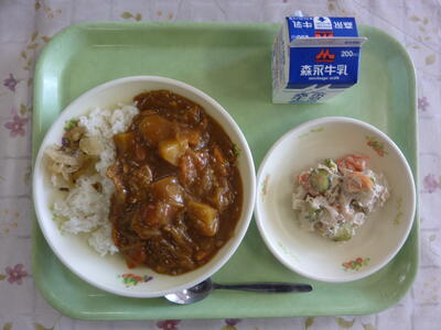 カレーライス(麦ごはん、チキンカレールー)、キャベツとりんごのサラダ、牛乳