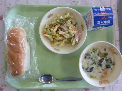 コッペパン、春雨スープ、マカロニサラダ、牛乳