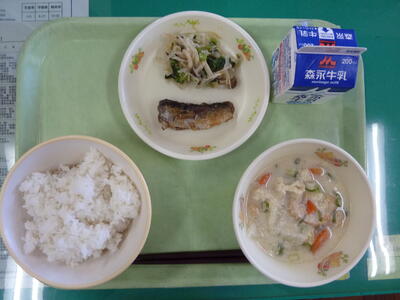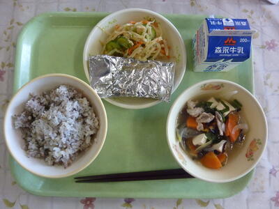 麦ごはん、呉汁、いわしのみぞれ煮、きのこ和え、牛乳