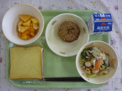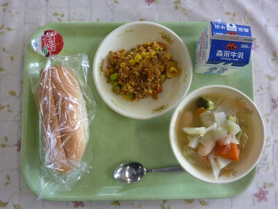 コッペパン、ポトフ、カレーミートビーンズ、すりおろしりんごゼリー、牛乳