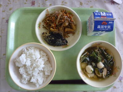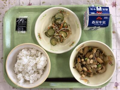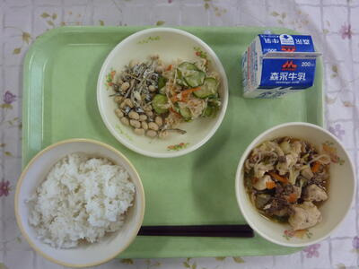 麦ごはん、大豆の磯煮、ごま酢和え、ひじきのり、牛乳