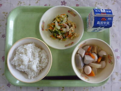 麦ご飯、けんちん汁、千草焼き、ゴマじゃこ和え、牛乳
