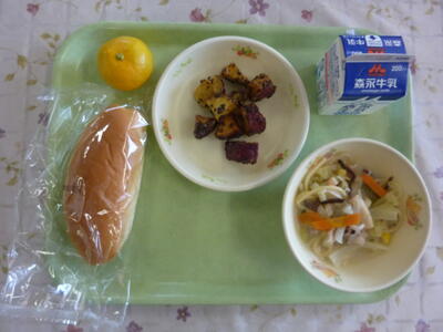 ミルクパン、ちゃんぽん、大学芋、みかん、牛乳