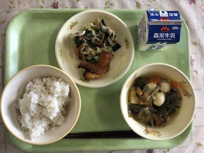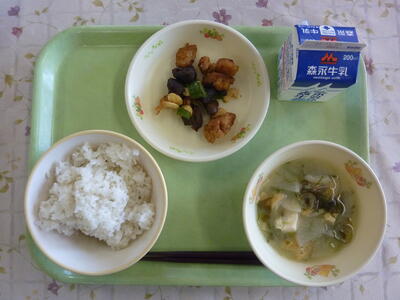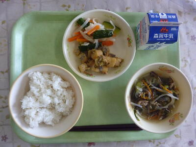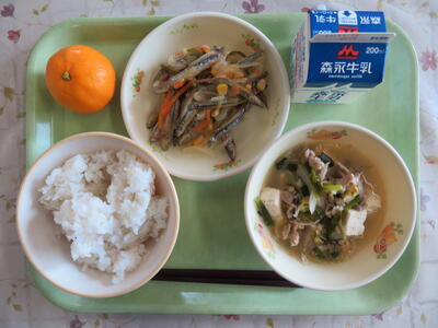 麦ごはん、うずらの卵のすまし汁、鶏のピリ辛焼き、御船川のおかか和え、牛乳