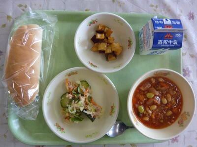コッペパン、大豆とひき肉のトマト煮、ツナサラダ、キャラメルポテト、牛乳