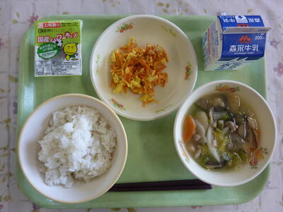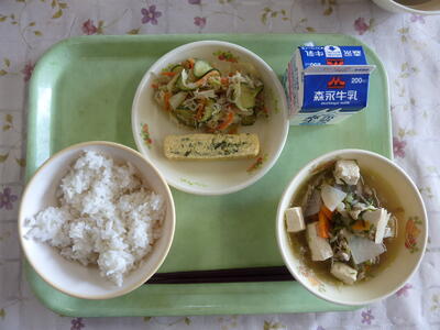 麦ごはん、ちゃんこ風スープ、ちくわの磯辺揚げ、キャベツのゆかり和え、牛乳