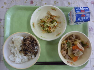 麦ごはん、肉と野菜の旨煮、かみかみ酢の物、手作りひじきふりかけ、牛乳
