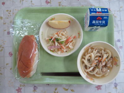 ミニミルクパン、きつねうどん、大根サラダ、りんご、牛乳